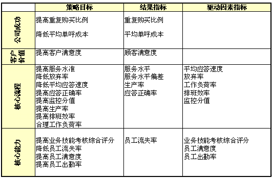 1)公司成功;2)客戶價值;3)核心流程;4)核心能力;成為呼叫中心全程全網(wǎng)考核衡量的四大維度,實際反映了呼叫中心運營管理中成本、客戶、內(nèi)部流程及呼叫中心的學習與成長的四個至關(guān)重要的領域,是實現(xiàn)公司遠景規(guī)劃與使命的營運管理核心。