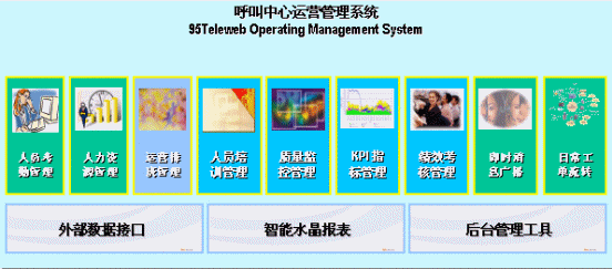 Teleweb-OMS運營管理系統(tǒng)共有11個模塊,涵蓋了動態(tài)質(zhì)檢管理、培訓(xùn)管理、考勤管理、人力資源管理、話務(wù)預(yù)測與自動排班、KPI管理、績效考核、部門間的需求單管理等各個環(huán)節(jié),并且提供了外部數(shù)據(jù)抽取功能和報表自動生成功能。