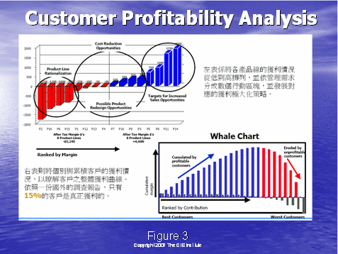 圖3右下角的鯨狀圖進(jìn)一步地說明了情況:它根據(jù)客戶分配成本,而更清楚地看到客戶收益性。行動成本計(jì)算或ABC可以使確保您的業(yè)務(wù)實(shí)現(xiàn)贏利的關(guān)鍵成本更清楚易懂。讓我們看一個例子,來比較兩種獲得和保持手機(jī)用戶的不同的方法。你將看到該高水平分析法可以很充分地使對呼叫中心利潤的基本要素有更深的理解。