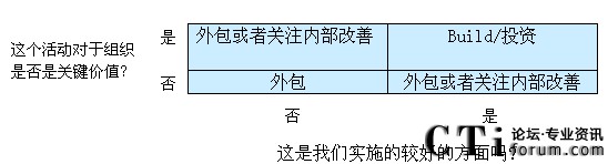 如果這個(gè)活動(dòng)是關(guān)鍵任務(wù),而且有時(shí)候你有穩(wěn)固的內(nèi)部資源和已經(jīng)證明的能力,那么你很可能想保持自建活動(dòng),并內(nèi)部投資其增長(zhǎng)。但是,如果這個(gè)活動(dòng)不是那么重要,或者你現(xiàn)在在做的事并沒(méi)有做好,那么外包的意義就更大。