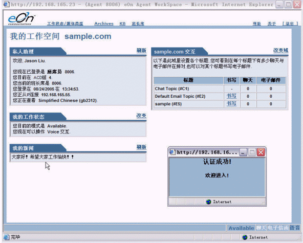 上圖是eQueue坐席員的標(biāo)準(zhǔn)工作界面,其中左側(cè)包含的信息有:坐席員個人資料、隸屬的坐席組、工作狀態(tài)、可服務(wù)的媒體類型、系統(tǒng)公告;右側(cè)有隊列中處于等待狀態(tài)的呼叫請求數(shù)量。界面上方設(shè)置有益昂公司特色的知識庫(KB)鏈接,單擊鏈接可以查找到客戶所關(guān)心問題的標(biāo)準(zhǔn)回復(fù)內(nèi)容。在這個界面里,坐席員可以完成包括語音呼叫、電子郵件在內(nèi)的所有工作。
