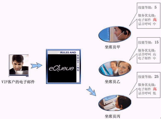 我們假設(shè)在某個聯(lián)絡(luò)中心里,有甲、乙、丙三位坐席員工作在同一個項目組(坐席組)。甲是新員工,只具有基本服務(wù)技能,經(jīng)驗很有限;乙是一位擁有豐富經(jīng)驗的坐席員,語音呼叫應(yīng)答技巧非常嫻熟,具有回復(fù)電子郵件的技能但是熟練程度略低于語音應(yīng)答技能;丙是一位經(jīng)驗豐富、技能全面的坐席員,業(yè)務(wù)熟練,其最擅長的是回復(fù)客戶的電子郵件。假設(shè)有一位重要客戶發(fā)來電子郵件咨詢一個非常專業(yè)的技術(shù)問題。由于這是一位VIP客戶,服務(wù)條款中規(guī)定了他所有的呼叫請求都必須由經(jīng)驗豐富的坐席員來響應(yīng)。在eQueue多媒體單一隊列中,他的電子郵件被限定為坐席員的技能只有達(dá)到或超過等級15才有資格回復(fù)。在3個坐席員中,甲因為技能等級只有5,不能滿足回復(fù)郵件的先決條件,雖然擁有此項技能且優(yōu)先級為高,依然沒有資格響應(yīng)這個聯(lián)絡(luò)請求;乙、丙的技能等級都滿足回復(fù)郵件的條件,但是丙的此項技能服務(wù)優(yōu)先級為高,因此,在丙坐席員處在可服務(wù)狀態(tài)下,eQueue會將此VIP客戶的電子郵件優(yōu)先派發(fā)給她。只有當(dāng)她處于忙碌狀態(tài)時,才會派發(fā)給乙坐席員。