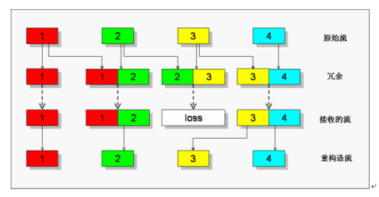 當?shù)?個包在傳輸過程中丟失時,由于包“3”被冗余編碼到第4個傳輸包中,在對端接收到碼流后還可以正常重構(gòu)出包“3”。