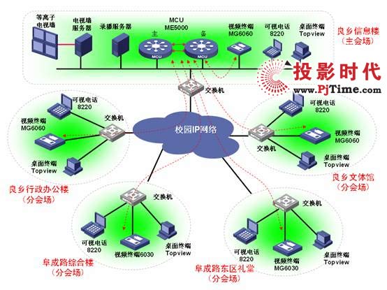 ME5000(配置32*768K)型MCU,在主會(huì)場(chǎng)及各分會(huì)場(chǎng)會(huì)議室共配置9臺(tái)高清會(huì)議室型會(huì)議終端(MG6060)和4臺(tái)標(biāo)清會(huì)議室終端(MG6030);同時(shí)學(xué)校領(lǐng)導(dǎo)桌面部署120部可視電話(huà)和12套桌面終端,具體視頻會(huì)議組網(wǎng)拓?fù)鋱D如下所示: