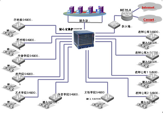 S8505萬兆核心路由交換機作為整個網(wǎng)絡(luò)的核心,以高密度、大容量的轉(zhuǎn)發(fā)性能為豐富的業(yè)務(wù)提供支持。Quidway? S8505萬兆核心路由交換機具備178Mpps的處理能力,300G的交換容量,并可以升級到600G;接入采用為教育行業(yè)定制的E026/E050交換機,實現(xiàn)整網(wǎng)的安全接入的完善的帶寬管理功能。網(wǎng)絡(luò)出口采用NE20-8第五代路由器實現(xiàn)雙出口,實現(xiàn)靈活的路由策略。