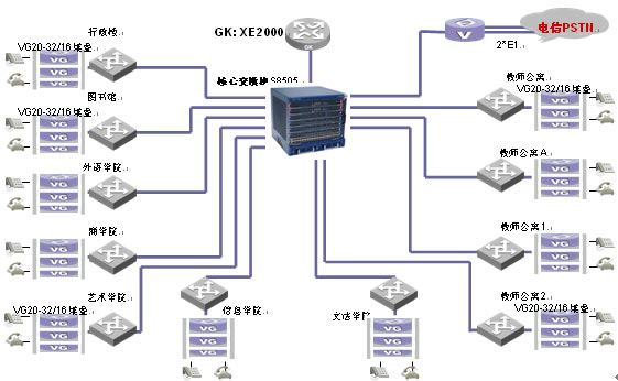 IP語音網(wǎng)采用華為3Com全系列語音視訊產(chǎn)品。為了滿足學(xué)校通訊的需求,華為3Com選用Quidway XE2000 IP PBX語音服務(wù)器作為核心呼叫控制設(shè)備,作為獨立控制的語音服務(wù)器,網(wǎng)絡(luò)規(guī)劃完®全自主,實現(xiàn)快速部署。采用50余臺ViewPoint®