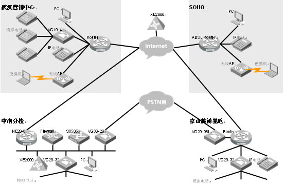 要求實現(xiàn)IP語音網(wǎng)絡(luò)向廣域網(wǎng)的擴展,實現(xiàn)IP語音無處不在,內(nèi)部電話完全免費。并保證廣域網(wǎng)的安全訪問。