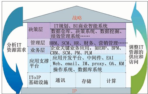 按照華為3Com的構(gòu)想,如果把整個(gè)IT系統(tǒng)比做一座房屋,那么整個(gè)房屋的地基就是IP網(wǎng)絡(luò),需要基于IP網(wǎng)絡(luò)來(lái)構(gòu)建通信、存儲(chǔ)、計(jì)算等IT基礎(chǔ)設(shè)施。在這些基礎(chǔ)設(shè)施之上,則是應(yīng)用支撐平臺(tái)(操作系統(tǒng)、數(shù)據(jù)庫(kù)系統(tǒng)、應(yīng)用開(kāi)發(fā)平臺(tái)等),基于應(yīng)用支撐平臺(tái)提供給機(jī)構(gòu)的關(guān)鍵業(yè)務(wù)流程信息系統(tǒng)(如ERP、SCM等),最終為用戶的管理和決策提供支持!霸趹(zhàn)略與IT基礎(chǔ)設(shè)施之間實(shí)現(xiàn)實(shí)時(shí)同步互動(dòng),IT為用戶高層提供商業(yè)智能系統(tǒng)、決策系統(tǒng),以便決策層即時(shí)掌握信息,作為機(jī)構(gòu)戰(zhàn)略決策、戰(zhàn)略挑戰(zhàn)的依據(jù);用戶可以依據(jù)內(nèi)、外部變化,進(jìn)行戰(zhàn)略調(diào)整時(shí)快速分析新的IT資源需求,同步調(diào)整IT資源的配置,從而使IT與業(yè)務(wù)戰(zhàn)略保持同步。”這正是IToIP的基本理念。