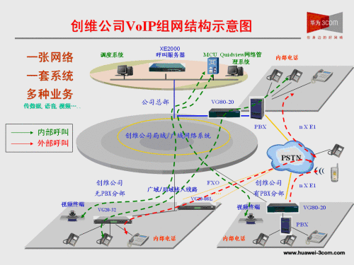整個解決方案大量使用了華為3Com公司自主研發(fā)的XE2000、VG80-20、VG20-32、VG20-16、VG21-08等一系列VOIP系統(tǒng),整個石巖基地語音點數(shù)覆蓋1500點以上,未來發(fā)展可以擴展到2500點。