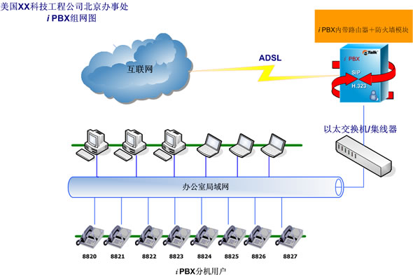 iPBX系統(tǒng)建設辦公室局域網(wǎng)絡,省去了購買路由器、防火墻等的投入和繁瑣的布線。