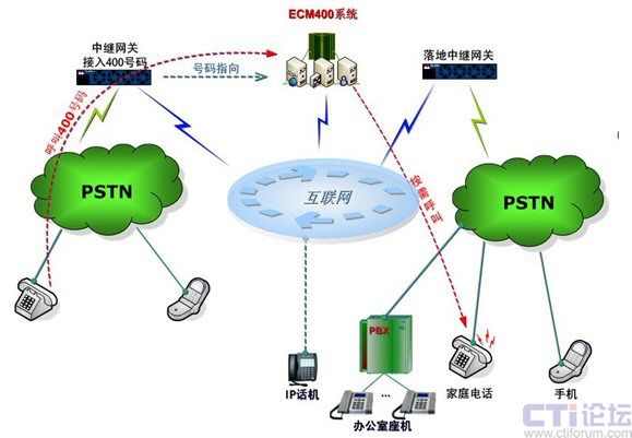 申請到400號碼的服務(wù)商,通過TG中繼網(wǎng)關(guān),把400號指向ECM400系統(tǒng),從而在IP網(wǎng)和PSTN網(wǎng)上建立了一個完美的過渡橋梁,對不同的通訊方式進行了有效融合,能充分整合雙網(wǎng)的各種資源和功能,從而達到為企業(yè)提供更多、更好服務(wù)的目的。
