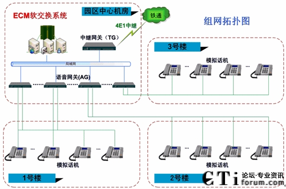 基地先完成機(jī)房到桌面的弱電布線,在大樓中心骨干機(jī)房,架設(shè)一套ECM軟交換系統(tǒng)組建電話通訊網(wǎng)絡(luò)。