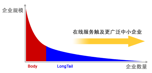 以上廠商的網(wǎng)絡(luò)廣告服務(wù)、電子商務(wù)服務(wù)都面向于中小企業(yè)市場(chǎng),而最近興起的SaaS(在線企業(yè)軟件服務(wù))也是希望通過(guò)互聯(lián)網(wǎng)服務(wù)的方式占領(lǐng)企業(yè)軟件市場(chǎng)的“長(zhǎng)尾”。