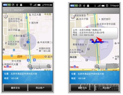 其二,打天下2.0新增了LBS的服務(wù)功能,原有的打天下只能實現(xiàn)拍照上傳、簽到等簡單功能應(yīng)用,而新版本則可以提供check的位置服務(wù),通過check可以在地圖上顯示標(biāo)記地點周邊分布的客戶地理位置信息,極大方便了外勤員工的路線制訂。