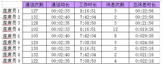 上面這張表格,畫出的就是9個(gè)座席員的話務(wù)數(shù)據(jù)情況,分別列出了通話次數(shù)、通話均長、工作時(shí)長、休息次數(shù)、總休息時(shí)長這五個(gè)KPI指標(biāo),你可以看的出來是哪一個(gè)座席員在呼攸嗎?