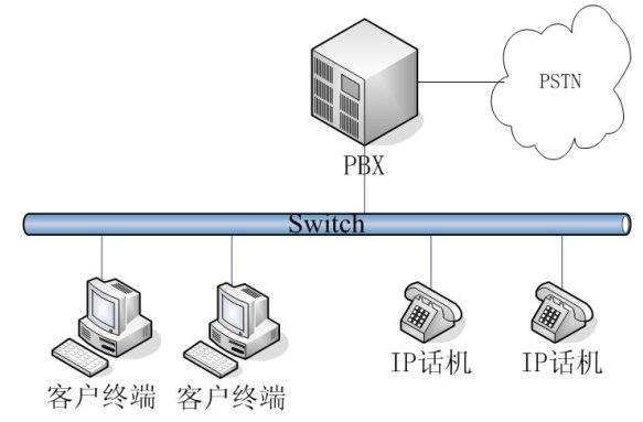 - 簡單網(wǎng)絡(luò)結(jié)構(gòu):一般適用于小型企業(yè)或企業(yè)內(nèi)某個(gè)部門的網(wǎng)絡(luò)結(jié)構(gòu)。內(nèi)部通訊在一個(gè)網(wǎng)段內(nèi),外部通訊通過一臺PBX交換。