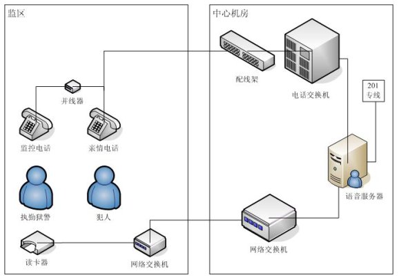 親情電話管理系統(tǒng)在系統(tǒng)設計中充分考慮監(jiān)獄的需求與特點,不但包含了一般親情電話錄音所需的全部功能,而且還融合了獄政管理的功能,整個系統(tǒng)采用集中式方式,在中心機房部署一套親情電話錄音服務器,各個監(jiān)區(qū)監(jiān)控系統(tǒng)利用監(jiān)獄內(nèi)部的局域網(wǎng)聯(lián)結成一個整體,形成一個能監(jiān)控監(jiān)獄親情電話的全網(wǎng)。這樣即可以在每個監(jiān)區(qū)監(jiān)聽,也可以在監(jiān)獄內(nèi)部網(wǎng)的任何地方對親情電話進行全程監(jiān)視。該系統(tǒng)能夠完全滿足目前監(jiān)獄的需求,產(chǎn)品性價比遠遠高于市場上其他同類產(chǎn)品。
