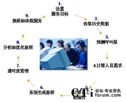 Impact 360 WFM提供一整套的集成排班管理應(yīng)用程序,幫助呼叫中心在三個關(guān)鍵并且時常是沖突的要素之間作出優(yōu)化。他們是:客戶的滿意度、員工的的滿意度與穩(wěn)定性,以及運營的成本。在排班管理過程中,WFM采用如下基本流程: