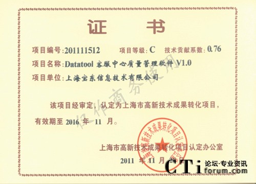 CTI論壇(ctiforum)12月7日消息(記者 張潔):2011年的最后一個月,寶東公司傳來又一好消息,公司的開發(fā)團隊自主開發(fā)研制的針對呼叫中心客服的質檢軟件“Datatool 客服中心質量管理軟件(簡稱DTQM)”經過市高新技術轉化項目認定辦公室層層審報審批,最終經審定,被認定為市高新技術成果轉化項目。