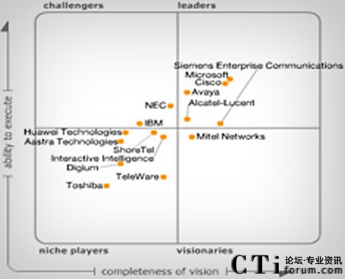 CTI論壇(ctiforum)10月8日消息(記者 楊佳林):在最近公布的2011年度Gartner統(tǒng)一通信魔法象限中,Avaya憑借其卓越“執(zhí)行能力”和“愿景完成度”躋身領(lǐng)導(dǎo)者象限。