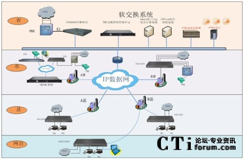 IP電話系統(tǒng)項目方案設(shè)計共分省、地州市、縣(市)三級進(jìn)行部署,按照省集團(tuán)至地州市分集團(tuán)、縣(市)級分集團(tuán)及營業(yè)廳建設(shè),全網(wǎng)通過部署相應(yīng)的IP電話設(shè)備(含語音軟交換、接入網(wǎng)關(guān)、PC軟電話、網(wǎng)管軟件、計費軟件等),組建全省IP電話系統(tǒng)。