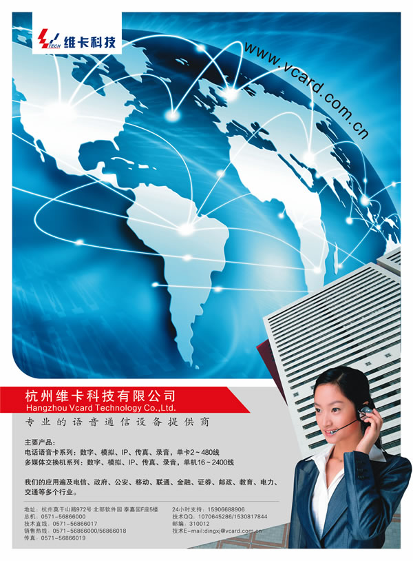 維卡科技有限公司(簡稱“維卡科技”)成立于2004年,是一家以下一代網(wǎng)絡通信為發(fā)展方向的高科技企業(yè),公司成立于上海,在杭州設立研發(fā)和生產(chǎn)基地,公司主要從事通信和語音產(chǎn)品的研究、開發(fā)、生產(chǎn)及銷售,是國內(nèi)通信語音產(chǎn)品―――電話語音卡的核心供應商之一。公司匯集一批多年從事CTI技術(shù)研究的高級專業(yè)人才,堅持自主創(chuàng)新,自主研發(fā),不斷推出適合人性化的一流產(chǎn)品,經(jīng)過短短幾年的發(fā)展,公司的語音卡產(chǎn)品已經(jīng)躋身全國三強,為中國的CTI行業(yè)貢獻了一份力量。