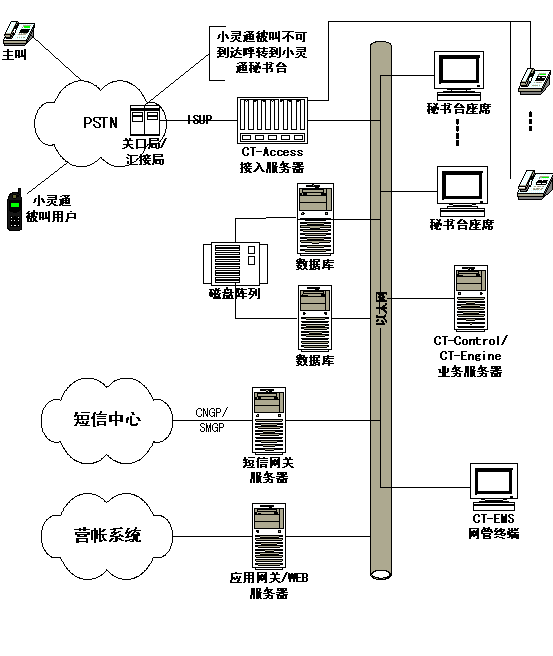 如上圖所示,小靈通秘書臺(tái)網(wǎng)絡(luò)拓?fù)鋱D,上圖中紅色虛線的左邊為運(yùn)營商部分,紅線是接口部分, 紅色虛線的右邊是增加的小靈通秘書臺(tái)設(shè)備和工程實(shí)施部分。首先需要在小靈通網(wǎng)絡(luò)的關(guān)口局或者匯接局設(shè)置被叫不可到達(dá)(關(guān)機(jī)、忙、不在服務(wù)區(qū))呼叫前轉(zhuǎn),通過ISUP協(xié)議呼叫到小靈通秘書臺(tái)的CT-Access接入服務(wù)器,提取主叫號(hào)碼、被叫號(hào)碼、原被叫號(hào)碼,同時(shí)給主叫播放語音,"您撥的用戶無法接通,您可以選擇失話復(fù)得業(yè)務(wù),本業(yè)務(wù)每條短信收費(fèi)0.1元,漏話提示請按1號(hào)鍵,短信回叫請按2號(hào)鍵,轉(zhuǎn)人工請按9號(hào)鍵"。然后根據(jù)主叫的響應(yīng)選擇提供服務(wù)(業(yè)務(wù)流程見第3章)。小靈通秘書臺(tái)的業(yè)務(wù)部分由CT-Control/CT-Engine業(yè)務(wù)服務(wù)器和數(shù)據(jù)庫服務(wù)器組成,另外包括人工臺(tái)和短信網(wǎng)關(guān),短信網(wǎng)關(guān)通過CNGP(網(wǎng)通)、SMGP(電信)和短信中心網(wǎng)關(guān)接口,實(shí)現(xiàn)短信發(fā)送功能。業(yè)務(wù)網(wǎng)關(guān)和WEB服務(wù)器為可選部分,根據(jù)業(yè)務(wù)需要選配。