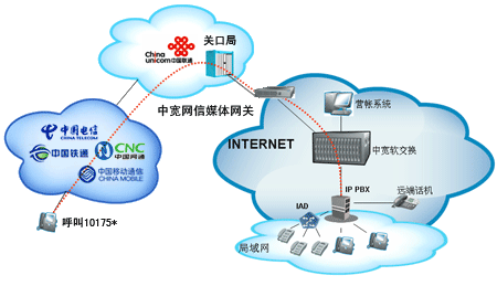 企業(yè)自行從網(wǎng)站上成功申請“企業(yè)商務(wù)通”業(yè)務(wù)后,通過101756*全國統(tǒng)一接入號結(jié)合網(wǎng)關(guān)和PBX,當(dāng)外部對企業(yè)申請的10175*號碼發(fā)起呼叫時(shí),該呼叫通過中國聯(lián)通的線路將話務(wù)指向中寬網(wǎng)信的媒體網(wǎng)關(guān),由中寬軟交換平臺(tái)將呼叫送至指定的PBX上,由PBX接續(xù)至總臺(tái)或相應(yīng)分機(jī)。另外,當(dāng)您使用該業(yè)務(wù)外呼時(shí),可以選擇在被叫電話上顯示10175*或隱藏號碼。
