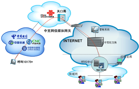 企業(yè)自行從網(wǎng)站上成功申請“企業(yè)商務(wù)通”業(yè)務(wù)后,通過101756*全國統(tǒng)一接入號結(jié)合呼叫中心,當(dāng)外部對企業(yè)申請的10175*號碼發(fā)起呼叫時(shí),該呼叫通過中國聯(lián)通的線路將話務(wù)指向中寬網(wǎng)信的媒體網(wǎng)關(guān),由中寬軟交換平臺(tái)將呼叫送至指定的呼叫中心,由呼叫中心完成相應(yīng)的服務(wù)。另外,當(dāng)您使用該業(yè)務(wù)外呼時(shí),可以選擇在被叫電話上顯示10175*或隱藏號碼。