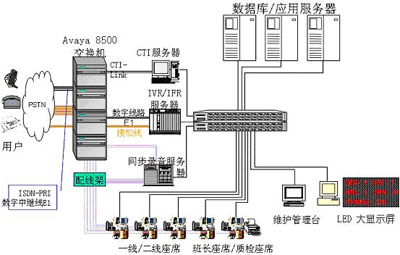 系統(tǒng)目前PSTN接入為120條中繼,90路自動(dòng)語(yǔ)音應(yīng)答系統(tǒng)(IVR),人工坐席數(shù)為30個(gè)。