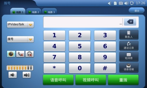 7寸大屏搭配寬大的數(shù)字虛擬鍵盤,讓你的撥號準(zhǔn)確無誤。同時界面的所顯示的通話功能諸如查找聯(lián)系人、查找通話記錄、發(fā)送短消息或者快速進(jìn)入語音信箱等功能也清晰明了。可以發(fā)現(xiàn)的是,用戶在輸完號碼之后可自主選擇采用語音呼叫還是視頻呼叫。另外,同潮流網(wǎng)絡(luò)之前的一款視頻電話GXV3140一樣的是,GXV3175也在出廠自帶了一個IPVideoTalk賬號。該賬號是出廠時就已配置好的,每一臺電話配備一個號碼并顯示在桌面上。也就是說,用戶在拿到GXV3175并聯(lián)網(wǎng)之后即可使用該賬號撥打免費的視頻電話了。這可是很多廠商所沒有的特殊功能。下面我們就使用隨機附送的IPVideoTalk賬號來撥打視頻電話。