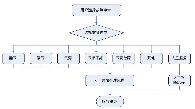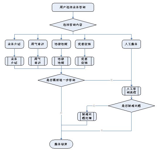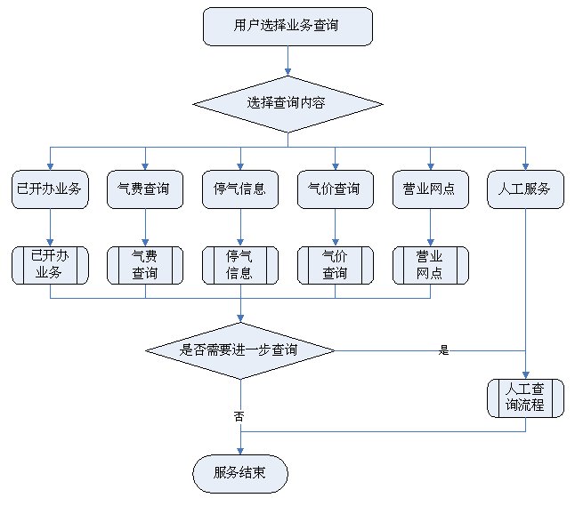 1)業(yè)務(wù)咨詢:用戶通過人工、自動語音等方式咨詢有關(guān)政策法規(guī)、資費標(biāo)準(zhǔn)、用氣常識、報裝方法等,系統(tǒng)以語音、傳真、Email、短消息等方式回復(fù)客戶。