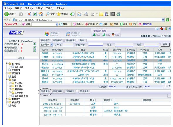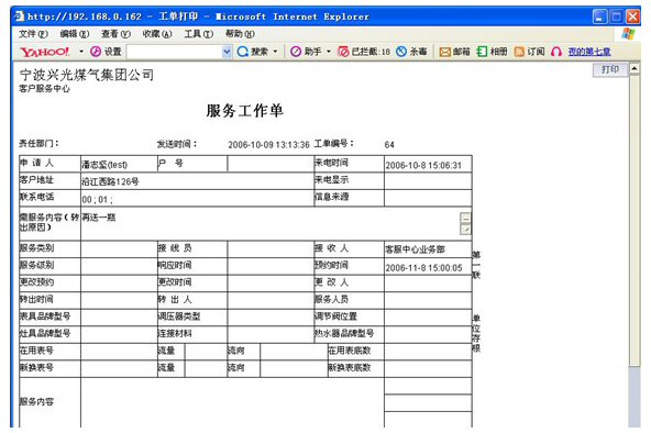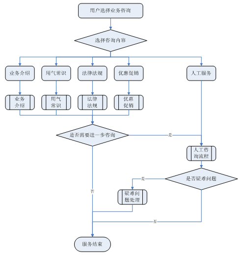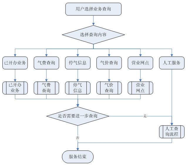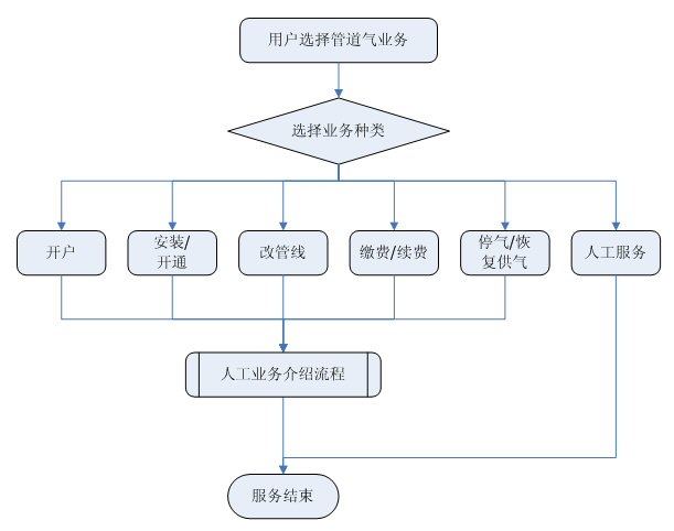 業(yè)務(wù)咨詢:用戶通過人工、自動語音等方式咨詢有關(guān)政策法規(guī)、資費(fèi)標(biāo)準(zhǔn)、用氣常識、報裝方法等,系統(tǒng)以語音、傳真、Email、短消息等方式回復(fù)客戶。