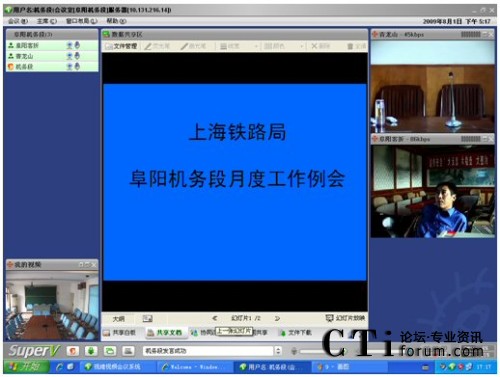 CTI論壇(ctiforum)08月06日消息: 日前,京九干線主力機務段——上海鐵路局阜陽機務段成功啟動視維Super-V視頻會議系統(tǒng)。阜陽機務段的領導和職工,每天早上8點上班后,第一件事情就是登陸視頻會議系統(tǒng),匯報前日工作情況、部署當日工作內容。已然,山大聯(lián)潤為上海路局阜陽機務段部署的阜陽機務段視頻會議系統(tǒng),成為鐵路部門必不可少的遠程溝通交流工具,在有效提高鐵路系統(tǒng)溝通效率的同時,保障了鐵路運輸?shù)陌踩瑯O大滿足了鐵路部門暑期運營業(yè)務對溝通和會議的需求。