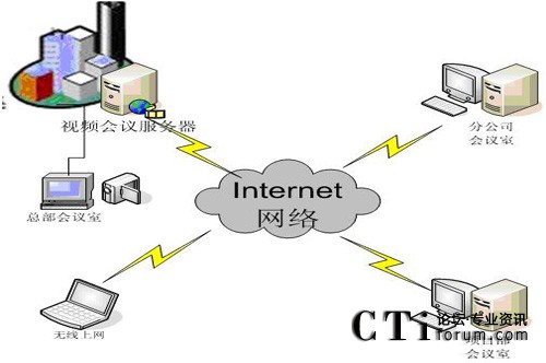 視維根據(jù)互聯(lián)網(wǎng)的網(wǎng)絡(luò)現(xiàn)狀和IT硬件資源制定了一套可行的平民化的低帶寬下的高清視頻會(huì)議解決方案。以企業(yè)總部為主會(huì)場,其他地區(qū)的分公司、各營銷網(wǎng)點(diǎn)和各移動(dòng)多媒體終端作為分會(huì)場,其網(wǎng)絡(luò)拓?fù)鋱D如下: