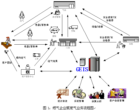GEIS燃?xì)膺\(yùn)營管理信息系統(tǒng)的應(yīng)用是企業(yè)的長期發(fā)展的驅(qū)動(dòng)力,它是一套以客戶服務(wù)接觸中心為龍頭、以運(yùn)營生產(chǎn)流程管理為龍身、以經(jīng)營分析為龍尾的閉環(huán)信息處理系統(tǒng)。它由客戶服務(wù)中心子系統(tǒng)、門市業(yè)務(wù)子系統(tǒng)、氣站管理子系統(tǒng)、安全搶修平臺(tái)和管理與集成模塊組成。實(shí)踐的事實(shí)告訴我們,它起到保持客戶忠誠度、提升企業(yè)品牌影響力、提高業(yè)務(wù)運(yùn)作效率、加快業(yè)務(wù)經(jīng)營決策和促進(jìn)企業(yè)持續(xù)發(fā)展的作用。