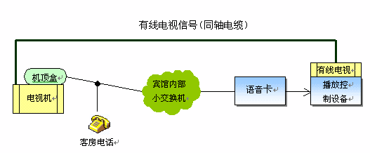 目前,越來(lái)越多的星級(jí)賓館開通了VOD點(diǎn)播系統(tǒng),從而開展收費(fèi)節(jié)目服務(wù)。該系統(tǒng)可以利用原有的賓館有線電視網(wǎng)絡(luò)和客房電話線來(lái)實(shí)現(xiàn),最大限度地利用了原有的設(shè)備,節(jié)省了投資。其系統(tǒng)構(gòu)成如下圖所示: