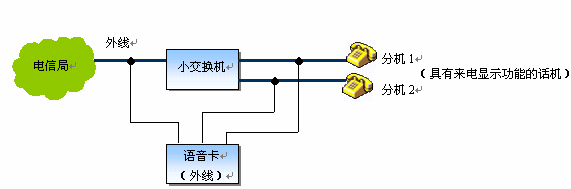 說(shuō)明:將語(yǔ)音卡的外線通道并接在小交換機(jī)的全部?jī)?nèi)外線端口上,在軟件的控制下,不僅可以將外線來(lái)電號(hào)碼轉(zhuǎn)發(fā)至分機(jī),并且還可以在內(nèi)線通話時(shí),看到通話對(duì)方的號(hào)碼,非常實(shí)用。當(dāng)然,如果直接采用語(yǔ)音卡(外線+座席)來(lái)構(gòu)成小交換機(jī),則系統(tǒng)更為簡(jiǎn)潔,成本也大為降低。