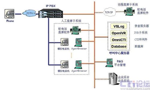 本方案采用IP-PBX 硬件平臺配合CTI系統(tǒng)軟件來建設(shè)呼叫服務(wù)系統(tǒng)。IP-PBX作為坐席接入的硬件接口平臺,采用上海傲威科技有限公司自主研發(fā)的IP-PBX產(chǎn)品AVX2000pro來實(shí)現(xiàn),AVX2000pro提供標(biāo)準(zhǔn)RJ11固件接口,為坐席員提供語音接入,坐席員耳麥話機(jī)直接與RJ11接口互連。坐席電腦通過局域網(wǎng)口與CTI軟件服務(wù)系統(tǒng)互連。