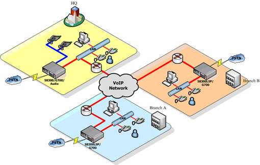各地之間通過H.323 IP Trunk將彼此連接在一起。G700媒體網(wǎng)關(guān)提供了強大的VoIP DSP,一個媒體網(wǎng)關(guān)在不增加VoIP資源卡 (MM760)的情況下,以同時支持64路G.711壓縮標(biāo)準(zhǔn)的語音通信。