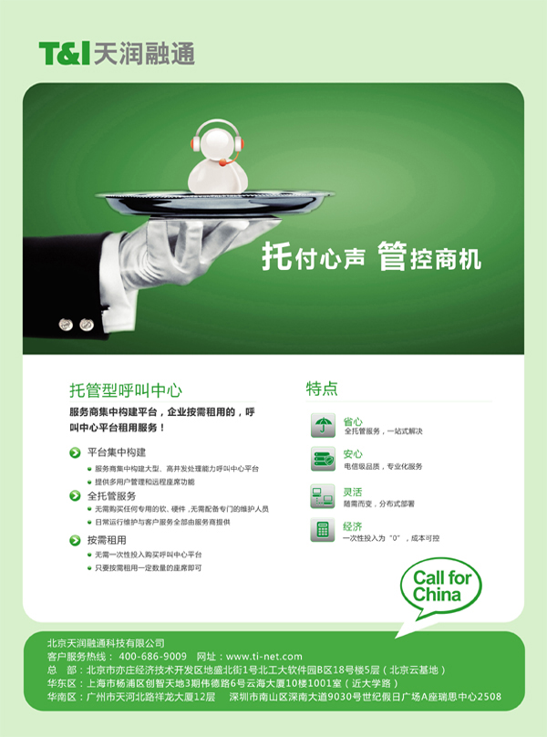 北京天潤融通科技有限公司致力于為企業(yè)提供簡單、易用、可依靠的托管型呼叫中心服務(wù),幫助企業(yè)更好地經(jīng)營其客戶資源。天潤融通是國內(nèi)呼叫中心領(lǐng)域內(nèi)領(lǐng)先的“云應(yīng)用”提供者。先后承接了百度全國客服中心、平安保險(xiǎn)北京客服中心、慧聰網(wǎng)呼叫中心、央視網(wǎng)絡(luò)客服中心、安博教育客服中心、圓通快遞客戶服務(wù)中心、飯統(tǒng)網(wǎng)客戶訂餐中心等大型的呼叫中心項(xiàng)目。服務(wù)的客戶遍及互聯(lián)網(wǎng)、教育培訓(xùn)、金融服務(wù)、旅游票務(wù)、電子商務(wù)、食品飲料、醫(yī)療保健、消費(fèi)品制造和銷售、物流、餐飲娛樂、電視購物等十多個(gè)領(lǐng)域達(dá)數(shù)千家企業(yè)客戶。