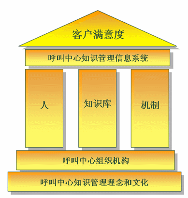 如上圖呼叫中心知識管理大廈。其是建立在呼叫中心知識管理理念文化、組織機構(gòu)基礎(chǔ)上,以人、知識庫、機制為核心,通過呼叫中心知識管理信息系統(tǒng)承載實施,以提高客戶滿意度為目的的綜合系統(tǒng)。