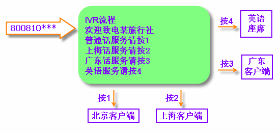 當(dāng)客戶撥打電話進入MVB2000系統(tǒng)平臺的呼叫中心。通過IVR導(dǎo)航,可隨意打到各地的客戶端,再通過客戶端進行更加細(xì)致的分類。并且,每個客戶端都可以互相轉(zhuǎn)接。IVR流程可以無限下拉菜單。