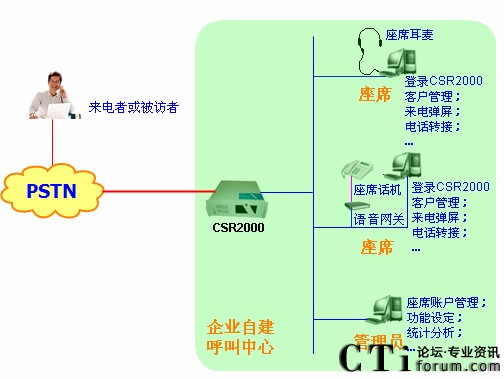 CSR2000是一套為豐富呼叫中心座席端應用而開發(fā)的座席管理軟件,包括:系統(tǒng)管理、呼叫日志、電話線路監(jiān)控、座席部分、客戶管理、產(chǎn)品部分等六個子模塊。CSR2000是基于B/S架構(gòu),管理員和座席人員均可以使用網(wǎng)絡上的終端設備(比如:PC機),通過局域網(wǎng)或者廣域網(wǎng)與呼叫中心服務器進行數(shù)據(jù)交互。
