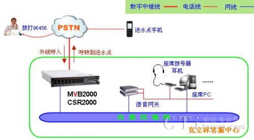 為了滿(mǎn)足廣大客戶(hù)的訂水要求,2009年下半年克立林從暢信達(dá)通信采購(gòu)呼叫中心系統(tǒng)一套,該系統(tǒng)采用1條數(shù)字中繼線(xiàn)(E1)作為接入線(xiàn)路,內(nèi)設(shè)16個(gè)人工座席。