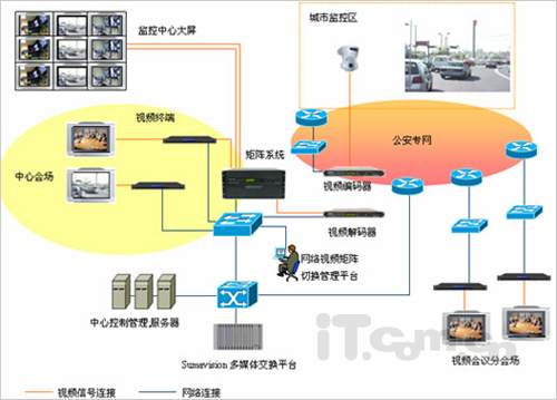針對的公安系統(tǒng)的需求以及上述原則,北京數(shù)碼視訊專門推出了符合公安需求的視頻會議系統(tǒng)版本和專門針對公安行業(yè)的視頻會議解決方案(網(wǎng)絡圖如下)。整體系統(tǒng)都體現(xiàn)了簡明、高效、清晰、穩(wěn)定可靠的特征。能有效提高指揮決策的效率,突出信息化優(yōu)勢,并應付一些突發(fā)事件或特殊情況。遇到緊急場合,如全國犯罪抓捕、救災、防汛、傳染性疾病突襲等,可以利用視頻服務系統(tǒng)及時了解情況、發(fā)布決策以及協(xié)調(diào)工作等等。