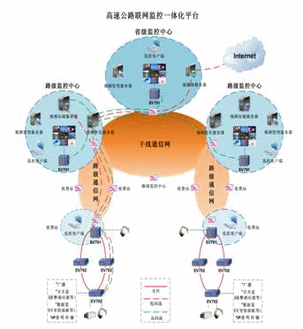 采用H.264編碼標(biāo)準(zhǔn)的EV702外場綜合接入設(shè)備,將原來外場分散的攝像頭、快球、云臺、可變情報板、報警感應(yīng)器等設(shè)備融為一體,同時也支持MPEG編碼標(biāo)準(zhǔn)的視音頻接入。EV702配備光纖通信板卡,不需要光端機,可以直接連接光纖,進行遠距離。通過EV702連接成環(huán),并且具有自愈功能?蛇M行集中式(路級監(jiān)控中心)、分布式(各級監(jiān)控中心)存儲。路級中心、區(qū)域中心、省級中心分布式多級監(jiān)控,由省中心統(tǒng)一設(shè)定權(quán)限,進行集中管理。