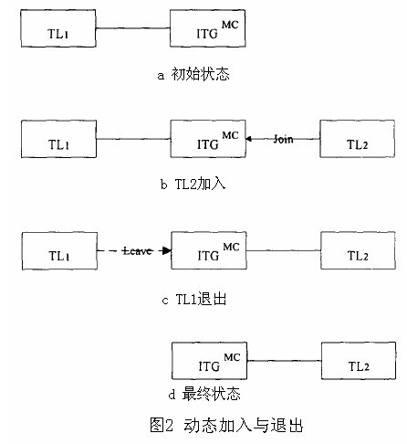 hoc多點會議的動態(tài)加入與退出是等價的。圖3(a)說明了ITG與TL1通信時的漫游。圖2(b)說明了子網(wǎng)1向子網(wǎng)2的移交處理。圖2(c)說明了在移交處理結(jié)束后ITG與TL1連接的中斷。最后,移交處理成功完成,只剩下ITG與TL2的連接,如圖2(d)所示。
