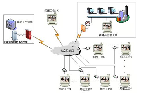 新疆建設兵團工會下設有14個師工會,111個團場工會.共有200個用戶同時參加視頻會議。中心服務器帶寬為100M光纖,各地終端通過網(wǎng)通2M寬帶接入,每個師、團級會場都有自己獨立的機房和會議室,適合進行基于IP網(wǎng)絡視訊會議的應用,在這個網(wǎng)絡平臺上,優(yōu)視(URSACOM)HotMeeting富媒體視頻會議系統(tǒng)所提供的高質量的視頻圖像和方便易用的文檔、文件共享功能,使得兵團工會領導能夠在這個平臺上進行從桌面討論到會議室正式會議等各種規(guī)模應用。通過HotMeeting富媒體視頻會議系統(tǒng),除了進行全團工會系統(tǒng)例會,工作交流等常見的應用之外,遠程培訓等也是經(jīng)常進行的內(nèi)容。各個師、團工會系統(tǒng)能利用數(shù)據(jù)功能和兵團總工會協(xié)調業(yè)務,也能把平常培訓的會議材料進行詳細介紹,節(jié)約了以前培訓所花費的大量精力和時間。具體網(wǎng)絡拓撲見下圖: