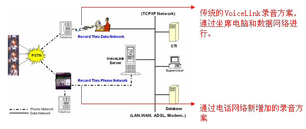 Voicelink 監(jiān)控錄音方案完全適應(yīng)現(xiàn)代呼叫中心的環(huán)境。Voicelink能有效的節(jié)約成本,它不需要專用硬件,能有效的利用包括座席計(jì)算機(jī)和網(wǎng)絡(luò)等公司的現(xiàn)有資源來(lái)進(jìn)行日常電話錄音。但考慮到有些呼叫環(huán)境只有涉及到電話呼入和呼出,也不用跟業(yè)務(wù)應(yīng)用或后臺(tái)數(shù)據(jù)(如證券交易平臺(tái))交互,現(xiàn)在,Voicelink增加了錄音方式來(lái)提高解決方案的能力,該錄音方式是通過(guò)電話網(wǎng)絡(luò)來(lái)錄音的,該新增加的錄音方式完全獨(dú)立于計(jì)算機(jī)和數(shù)據(jù)網(wǎng)絡(luò)。下圖顯示Voicelink提供不同的方式,形成一個(gè)單一的錄音平臺(tái)。